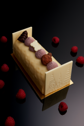 Biscuit viennois, ganache montée chocolat blanc, confit de griottes et framboises.