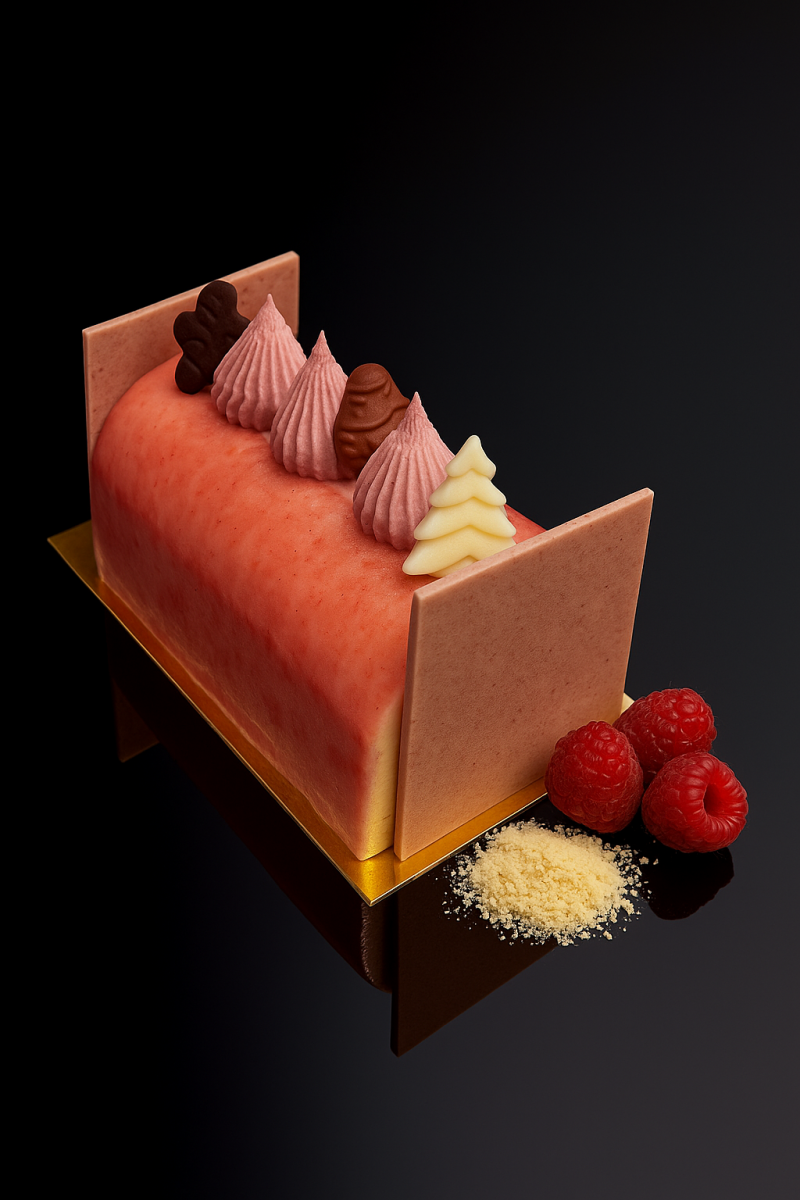 Pâte sablée aux amandes, crème cheesecake, confit de framboise, mousse cheesecake, ganache montée vanille.